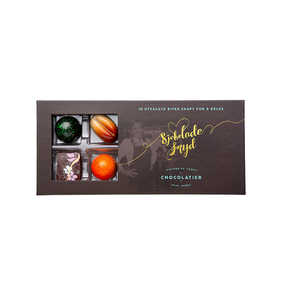 Innhold: Kakaomasse (kakaobønner, sukker, kakaofett, soyalecitin, vaniljeekstrakt og melkepulver), pistasjnøtt, hvetegluten, fløte, pasjonsfrukt, solbær, sitron, yusu, bringebær, glukose/invertsukker, sorbitol, sitronsyre, pektin, kaffe, lakris, smør, likør, salt, salmiakksalt, chili, pepper, konditorfarge E102, E104, E110, E122, E124, E132, E172, E555. Ca. 120 g.